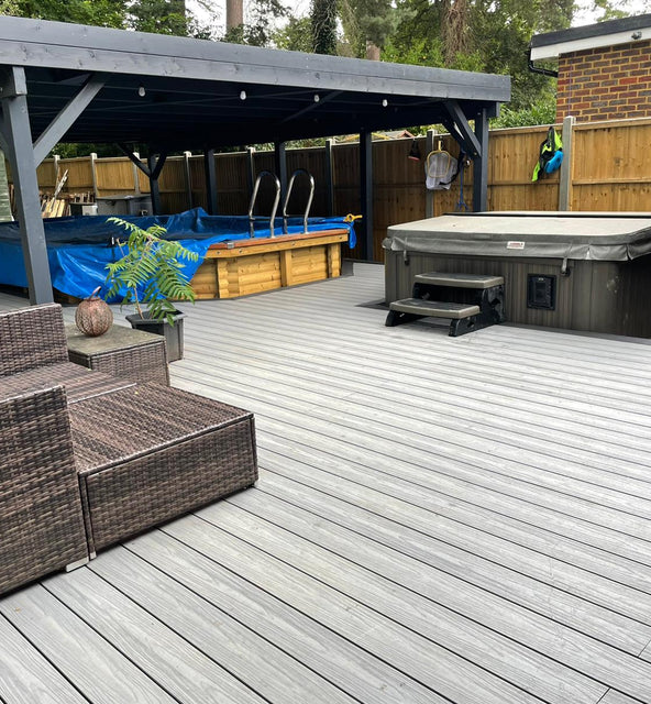Finally, we're thrilled to introduce the NaturaPlus™ Light Grey Grooved composite decking board, now offered at a special price of £31.14 per board, reduced from the original £34.62. This decking is an excellent option for those seeking to create inviting outdoor visiting areas.