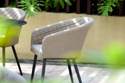 A modern look for your garden is certainly expressed by the Ambition Range. Six Quilted chairs surround a Oval Spray Stone Glass table, big enough to seat everyone in comfort.