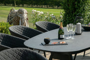 A modern look for your garden is certainly expressed by the Ambition Range. Eight Quilted chairs surround a Oval Spray Stone Glass table, big enough to seat everyone in comfort.