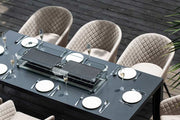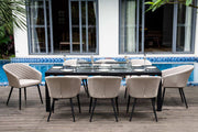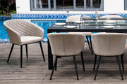 A modern look for your garden is certainly expressed by the Ambition Range. Eight Quilted chairs surround a Rectangular Spray Stone table, big enough to seat everyone in comfort. The modern twist takes a step further, having a Fire Pit in the centre, thus extending your social time, long into the evening. All of our Fire Pit systems are CE registered and have a BTU of 50,000 (British Thermal Unit is a unit that measures the heat generated by the burner). On average, depending on the setting used, our Fire Pits will produce approximately 6-7 hours use for a 7KG gas bottle. We recommend using a propane gas bottle, which can be stored underneath the table. Please note the ice bucket feature is not included with this product.