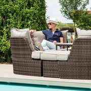New for 2020, this Daybed can double up as a Sofa Set. The Flat Weave Cheltenham Daybed is extremely versatile and can be configured in many different layouts. The two sofas will easily seat six comfortably when separated and the centre footstool transforms into a rising table, to suit the need. Two additional footstools completes the set.