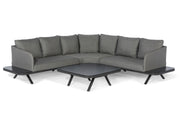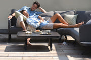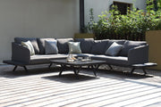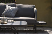 Luxurious cushions sit on top of the toning framework, which extends beyond to create floating side tables. A matching square coffee table completes the set.