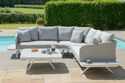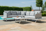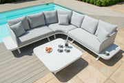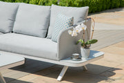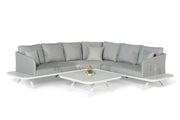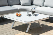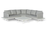 Luxurious cushions sit on top of the toning framework, which extends beyond to create floating side tables. A matching square coffee table completes the set.