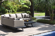 Luxurious cushions sit on top of the toning framework, which extends beyond to create floating side tables. A matching square coffee table completes the set.