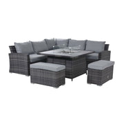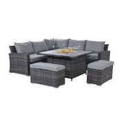 Kingston Corner Deluxe Dining Set with Fire Pit (aluminium slatted top includes glass surround, metal lid, firestones) | Grey | Flat Weave