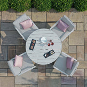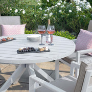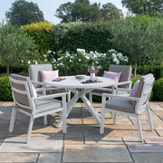 Wine and dine with our 4 seat round dining set, this smaller designed table has been created for those petite patio spaces. Made from light weight aluminium and the chairs crafted with a supporting back and cushion.