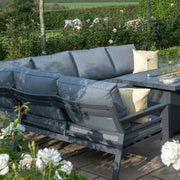The simplistic corner sofa that we have upgraded to the ultimate luxury corner! The grey aluminium framework makes it maintenance free and has thick padded cushions to sink into this summer. If space is limited, the corner sofa can easily seat 6 people. To complete the luxury touch, we have added a stylish table with integrated fire pit.