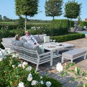 Wine or dine with family, the multifunctional table and corner set. Made of lightweight aluminium frames, this garden sofa set is maintenance free and offers supreme padded cushions. This white corner sofa can seat up to 5 people whilst the convenient corner shape optimises the use of space in your garden, complimented with a gas lift rising table.