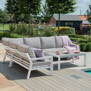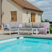 Made of lightweight aluminium frames, this garden sofa set is maintenance free and offers supreme padded cushions. This white corner sofa can seat up to 5 people whilst the convenient corner shape optimises the use of space in your garden, complimented with a chic aluminium coffee table.
