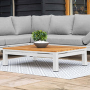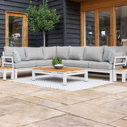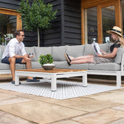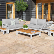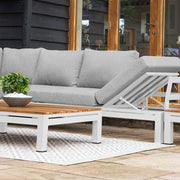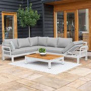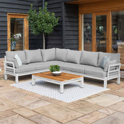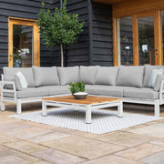 The Oslo Corner Group is where style meets comfort; with deep filled cushions, sleek white aluminium frames and a teak top coffee table.