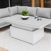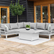 The Oslo Corner Group with Rising Table is where style meets comfort; with deep filled cushions, sleek white aluminium frames and a height adjustable table - which can easily swap between coffee tale and dining table height.