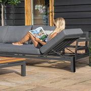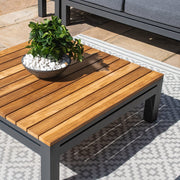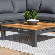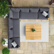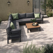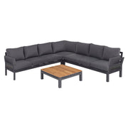 The Oslo Large Corner Group is where style meets comfort; with deep filled cushions, sleek grey aluminium frames and a teak top coffee table