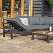 The Oslo Large Corner Group - With Square Gas Fire Pit Table is where style meets comfort; with deep filled cushions, sleek grey aluminium frames and a teak top coffee table