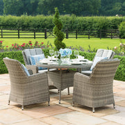 The Oxford 4 Seat Round Dining Set with Venice Chairs brings a touch of luxury to your al fresco dining. The round table teamed with four high-back chairs complete with base and back cushions make this the perfect set to share breakfast, lunch, or dinner!