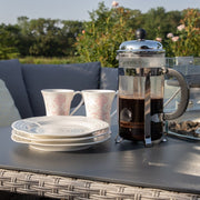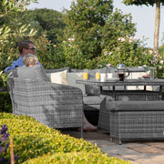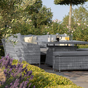 The Santorini Deluxe Corner Dining Set with Fire Pit Table combines a luxurious corner sofa with two matching benches and a fire pit table. The elegant mixed grey weave and deep filled cushions ensure maximum comfort whilst the fire pit table allows you to extend the use of your garden furniture late into the evening.