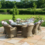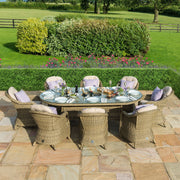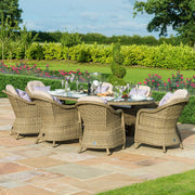 The Winchester 8 Seat Dining Set with Heritage Chairs brings a touch of luxury to your al fresco dining. The oval topped with toughened glass teamed with the eight comfortable chairs complete with base and back cushions to make this the perfect set to share breakfast, lunch, or dinner! This set comes with an integrated ice bucket in the table top and a glass lazy susan.