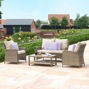 The Winchester weave is our most traditional style, reminiscent of English country houses. This classic look is achieved by using a natural-coloured round weave, creating the impression of wicker. The result is a finish that has a deep texture, with rounded corners for a more comfortable experience. The Winchester Square Sofa Set is a great combination of two armchairs paired with our classic two seat sofa, finished with square coffee table topped with toughened glass.