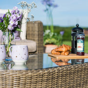 The Winchester Large Corner Group is recognisable for the thick shaped arms and backs to the set, The beige coloured cushions sit perfectly with the weave, creating a modern, elegant style. We recommend storing cushions inside overnight. As with all Maze products, it is made from the highest quality material, woven onto a powder coated aluminium frame that ensures its use all year.